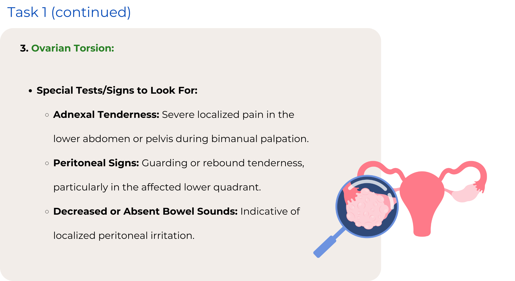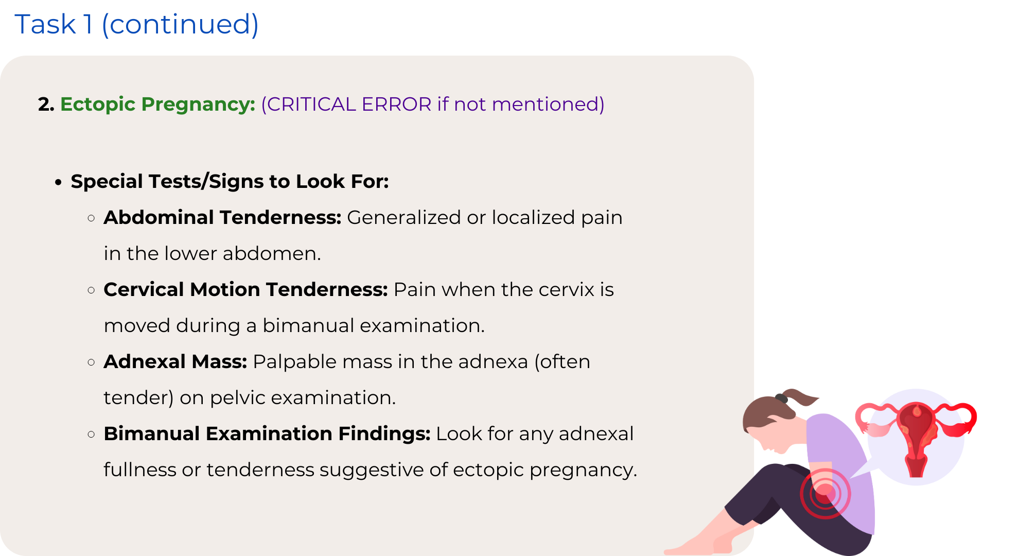 Focus on a systematic abdominal examination, differentiating between gynecological and non-gynecological causes to ensure a thorough examination.